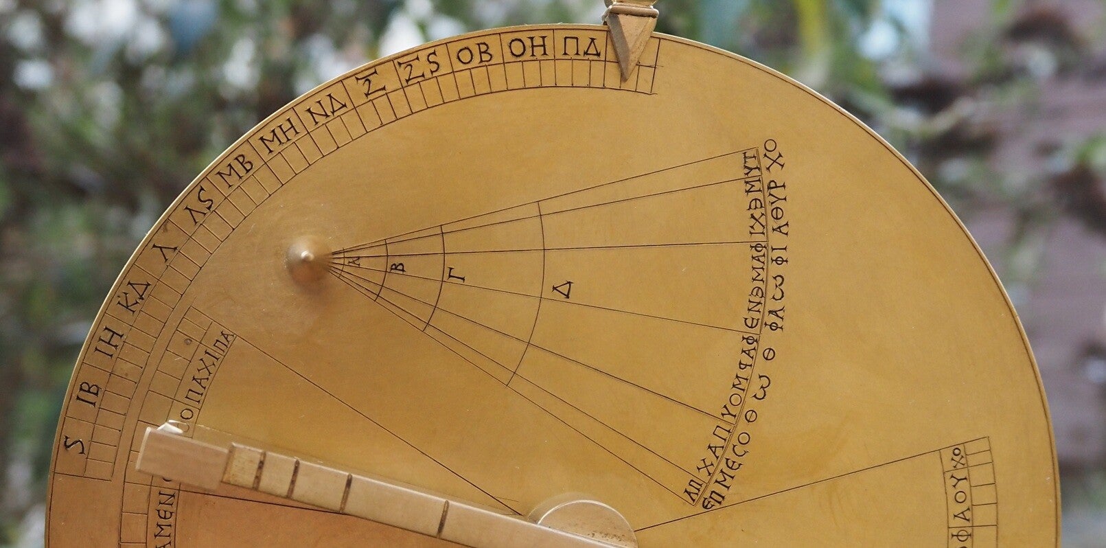 In the two non-central sectors there are flat hour scales for time measurement. These scales are called subsidiary dials. Their circular lines are inscribed by Greek letters Α, Β, Γ, Δ, Є, that is, 1, 2, 3, 4, 5. At the top of the sectors there are conical gnomons.