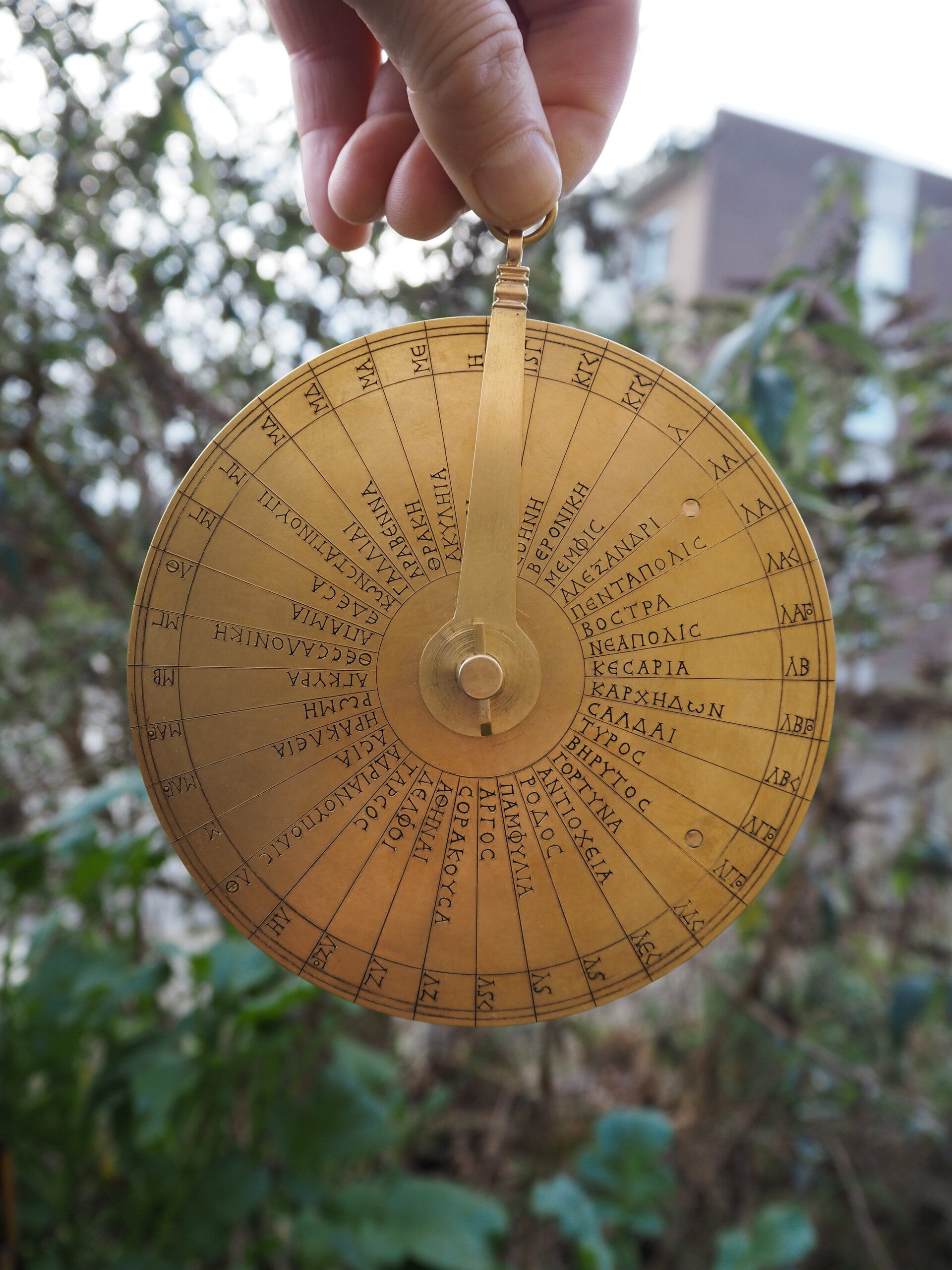 On the reverse side of the disc, there is a table of cities and provinces, or gazetteer. Thirty-six names are inscribed in Greek, each with the corresponding latitude.